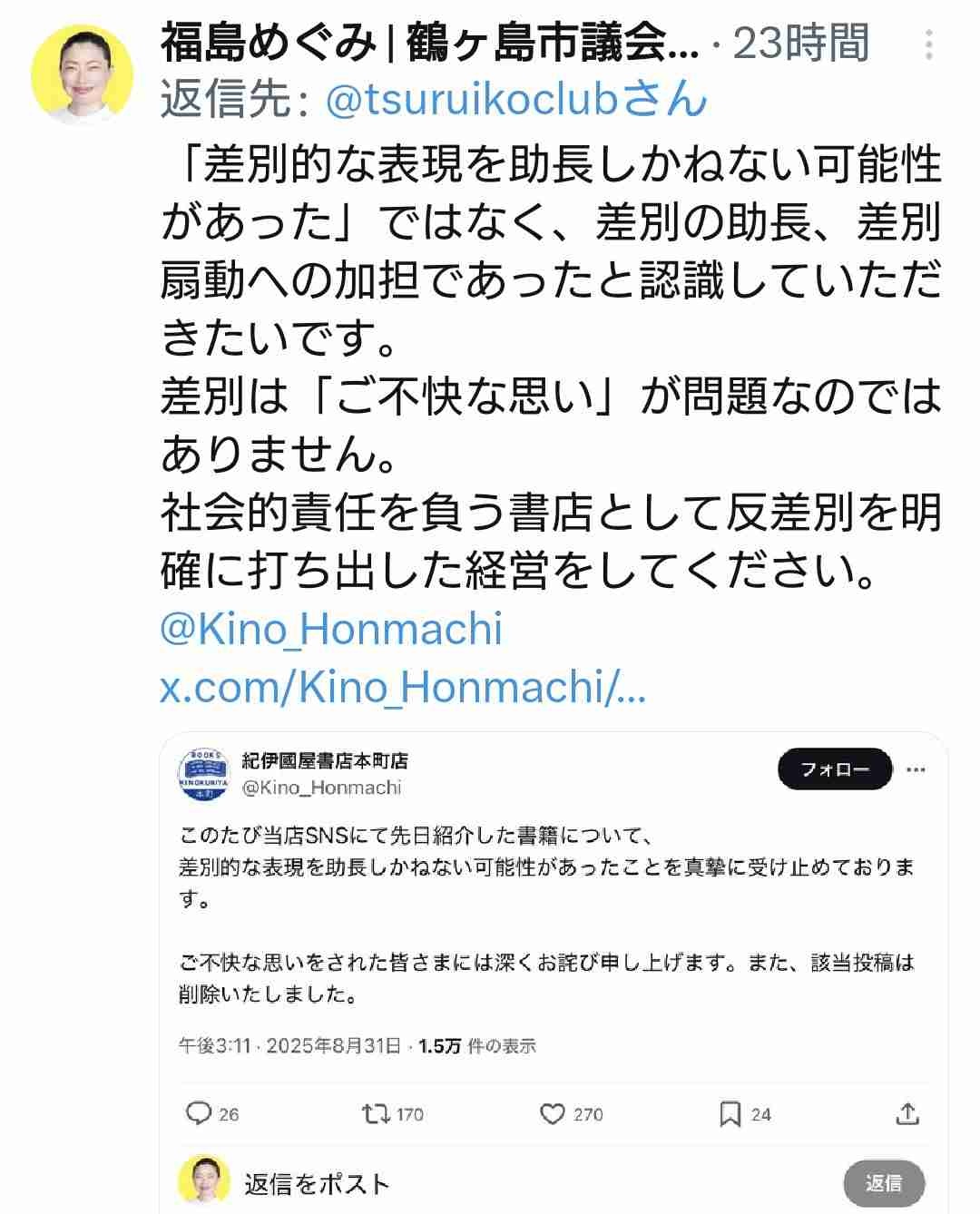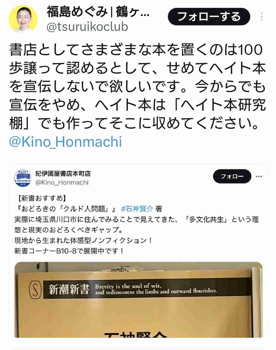 この投稿に対し、埼玉県の鶴ヶ島市議会議員・福島恵美氏が「書店としてさまざまな本を置くのは100歩譲って認めるとして、せめてヘイト本を宣伝しないで欲しいです」と反応。「今からでも宣伝をやめ、ヘイト本は『ヘイト本研究棚』でも作ってそこに収めてください」と批判した。