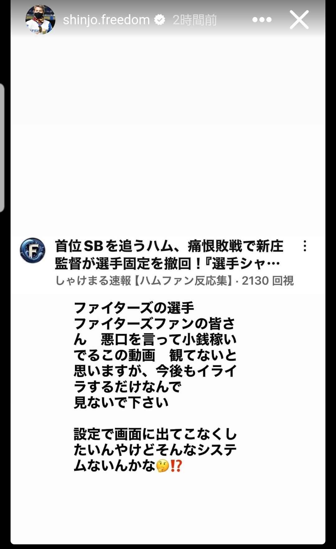 - 日本ハムの新庄剛志監督が4日、自身のインスタグラムのストーリーズに新規投稿。「イライラするだけなんで見ないで下さい」と選手、ファンに異例の呼びかけを行った。