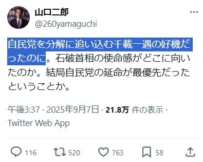 自民党が崩壊しても、総理にしがみつきたかった。 - 13 : 2025/09/07(日) 22:08:34.21 ID:ASNrH9o70