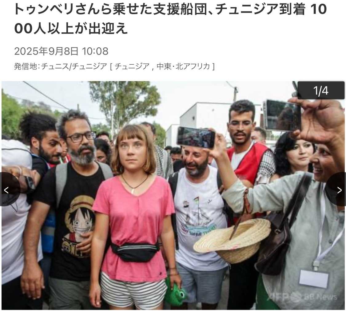 トゥンベリさんら乗せた支援船団、チュニジア到着 1000人以上が出迎え【9月8日 AFP】スウェーデンの環境活動家グレタ・トゥンベリさんや親パレスチナの活動家らを乗せバルセロナを出港した支援船団が7日、チュニジアに到着した。支援物資を積みパレスチナ自治区ガザ地区を目指している船団は、1000人を超える人々の出迎えを受けたwww.afpbb.com - 2 : 2025/09/08(月) 17:34:55.32 ID:zEExFdIRM