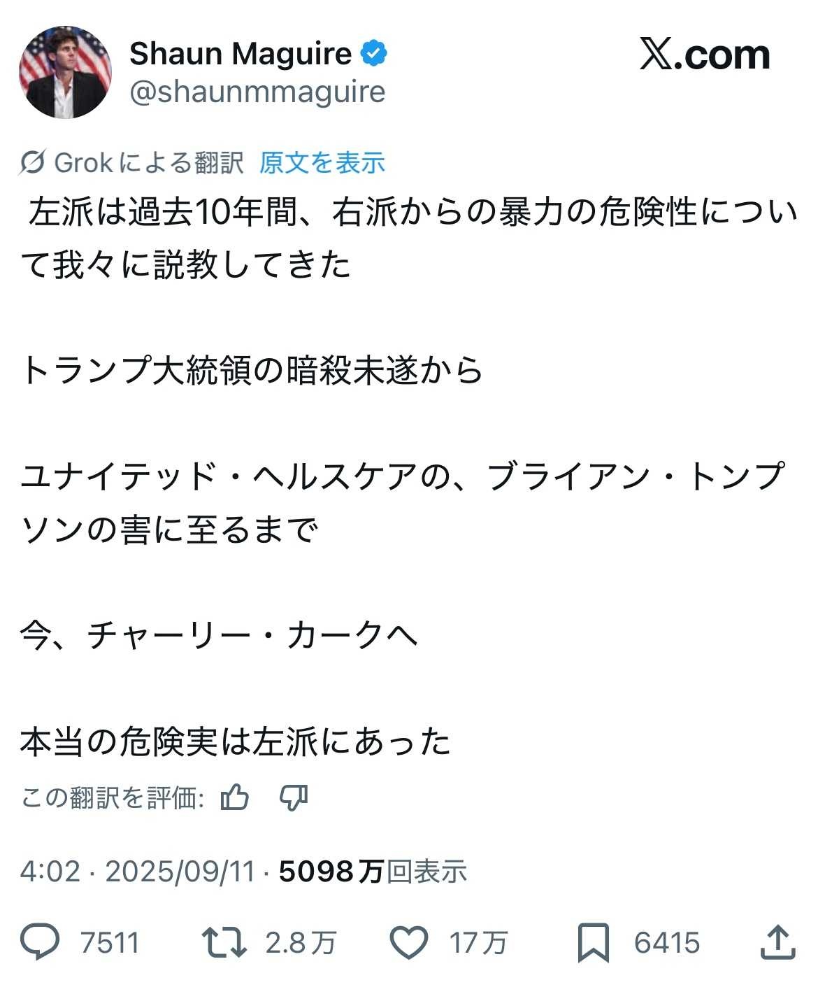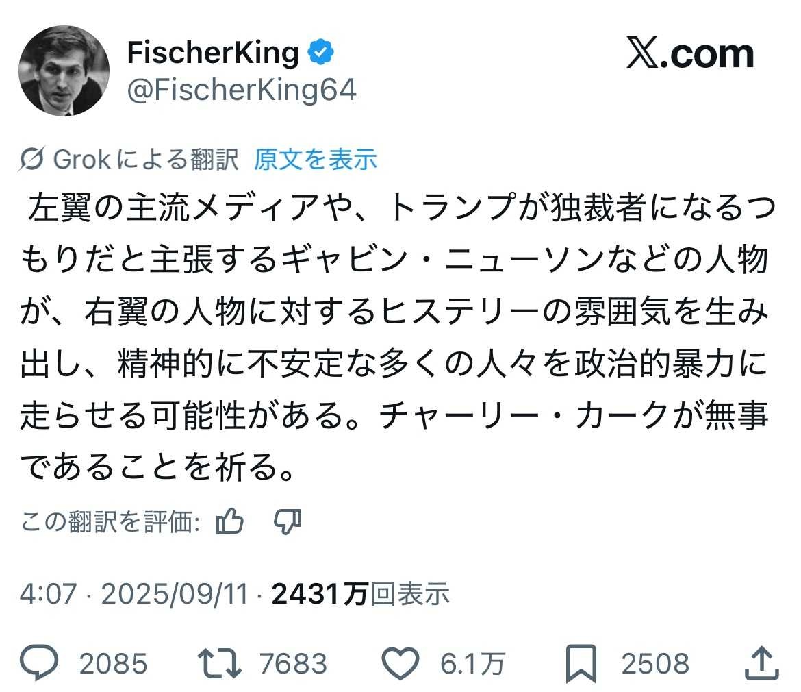 トランプ暗殺未遂と同じパターンじゃねえの - 3 : 2025/09/11(木) 21:35:19.10 ID:BxhYZY/A0
