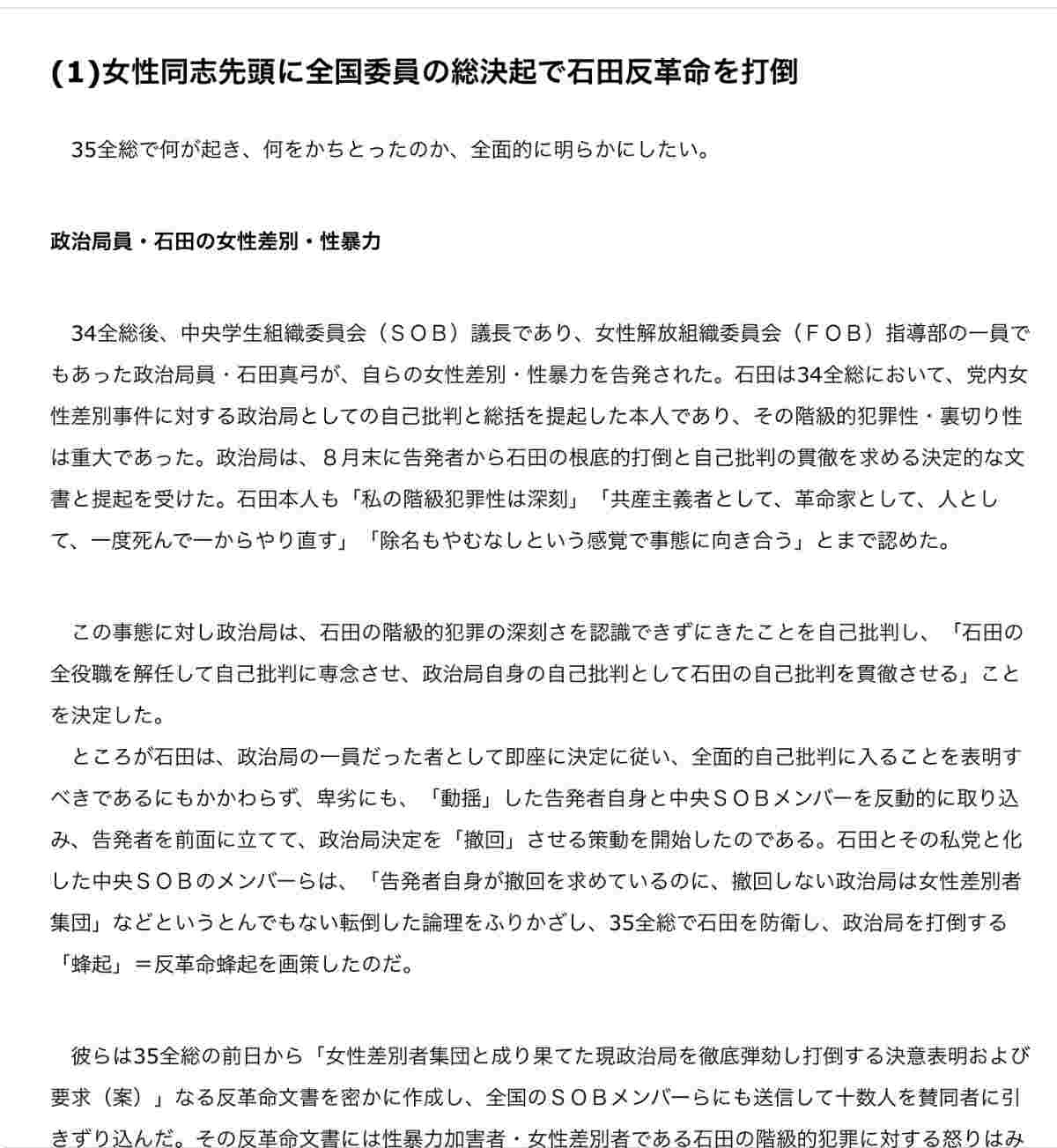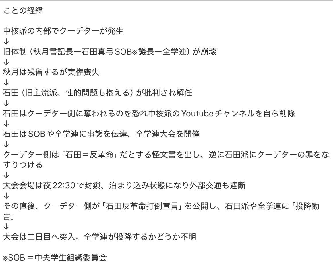 - 党中央での権力交代→旧体制崩壊→石田追放→両派が互いにクーデターだと非難→全学連大会が事実上包囲され、投降を迫られている模様