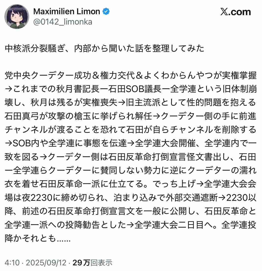 - 中核派でクーデターとか、マジで何が起きてるんだか全く分からん状況だよな。 決め付けは早い気がするな