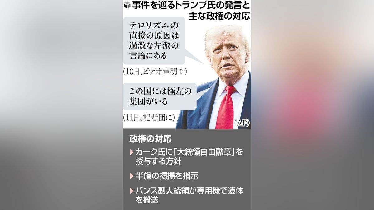政権は事件後、異例の対応を重ねた。哀悼の意を示すため、全ての連邦政府や軍の施設などで半旗を掲げるよう指示し、トランプ氏は米大統領が文民に与える最高位の「大統領自由勲章」をカーク氏に授与することを決めた。バンス副大統領は11日、事件現場のユタ州を訪れ、遺体を副大統領専用機でカーク氏の自宅があるアリゾナ州に搬送した。トランプ氏は11日、記者団に「この国には極左の集団がいる」と述べ、容疑者が明らかになっていない段階で、事件を左派勢力によるものだと非難。10日のビデオ声明でも、「テロリズムの直接の原因は過激な左派の言論にある」などと述べ、事件を左派によるカーク氏への批判と結びつけていた。